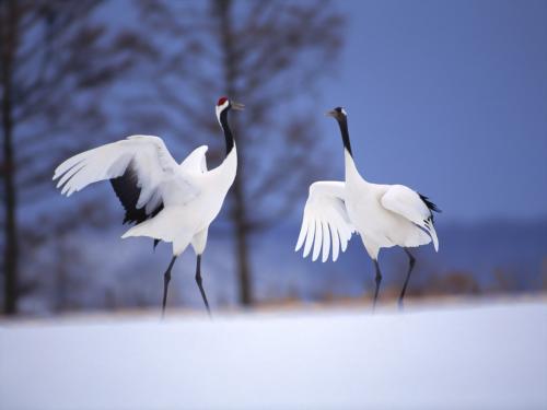 брачный танец журавлей зимою на снегу