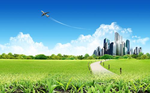 Скачать обои взлет самолета над полем в белых облаках на фоне небоскребов |